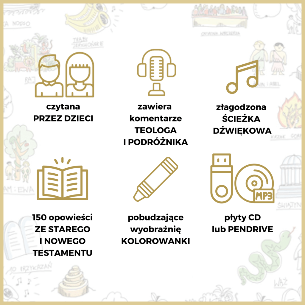 - W Biblii Audio KIDS odkryjesz 150 opowieści z biblijnego świata, przygotowanych specjalnie z myślą o najmłodszych słuchaczach! Każda historia opatrzona jest komentarzem biblisty dr Piotra Kosiaka lub podróżnika Jaśka Meli, którzy sprawiają, że z pozoru trudne treści, stają się dziecinnie proste!