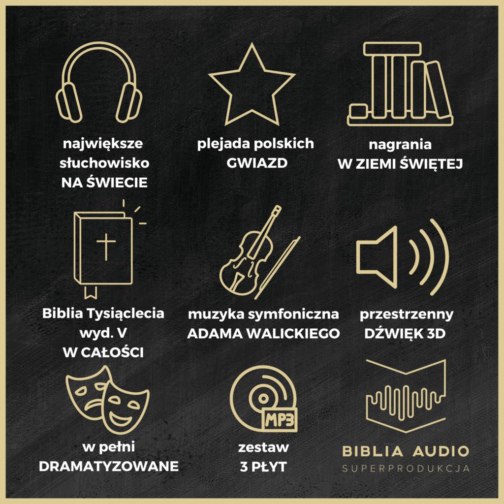 Poczuj się, jakbyś tam był, dzięki dającemu wrażenie głębi i przestrzeni dźwiękowi 3D, specjalnie skomponowanej muzyce Adama Walickiego oraz dźwiękom tła nagranym w samym sercu Ziemi Świętej! Szukasz Biblii z dużym drukiem, a i tak trudno zrozumieć, co czytasz? Nasz audiobook to świetny wybór zarówno dla osób ze słabszym wzrokiem, jak i pragnących po prostu lepiej poznać Pismo Święte. To Biblia ilustrowana Twoją wyobraźnią!