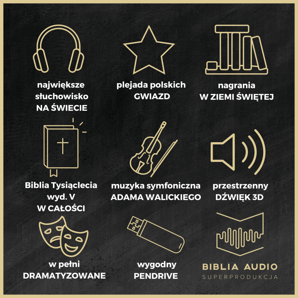 Poczuj się, jakbyś tam był, dzięki dającemu wrażenie głębi i przestrzeni dźwiękowi 3D, specjalnie skomponowanej muzyce Adama Walickiego oraz dźwiękom tła nagranym w samym sercu Ziemi Świętej! Szukasz Biblii z dużym drukiem, a i tak trudno zrozumieć, co czytasz? Nasz audiobook to świetny wybór zarówno dla osób ze słabszym wzrokiem, jak i pragnących po prostu lepiej poznać Pismo Święte. To Biblia ilustrowana Twoją wyobraźnią!